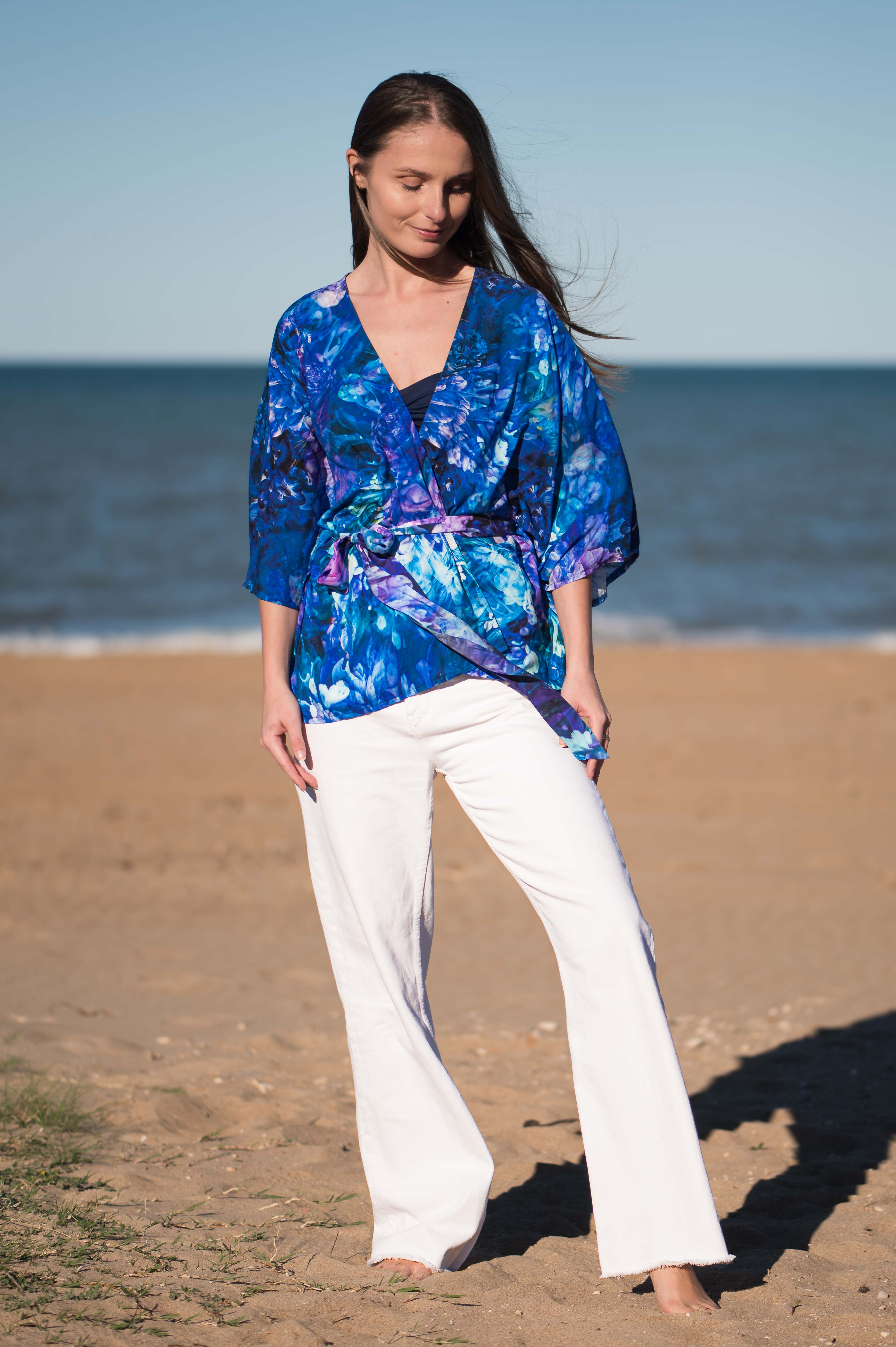 Zwiewne kimono spektakularnie rozwiane tworzy efekt "wow", przyciągając uwagę i dodając oryginalności Twojemu wyglądowi. Kimono wykonane jest z wysokiej jakości wiskozy, dzięki czemu jest lekkie, zwiewne i oddychające. Materiał ten gwarantuje maksymalny komfort nawet w najgorętsze dni. Niezależnie od tego, czy korzystasz z niego na plaży, czy nosisz jako stylowy dodatek, będziesz czuła się świeża i swobodna. Bądź kreatywna i eksperymentuj z różnymi sposobami noszenia naszego kimono, do kompletu możesz zamówić szorty lub spodnie!