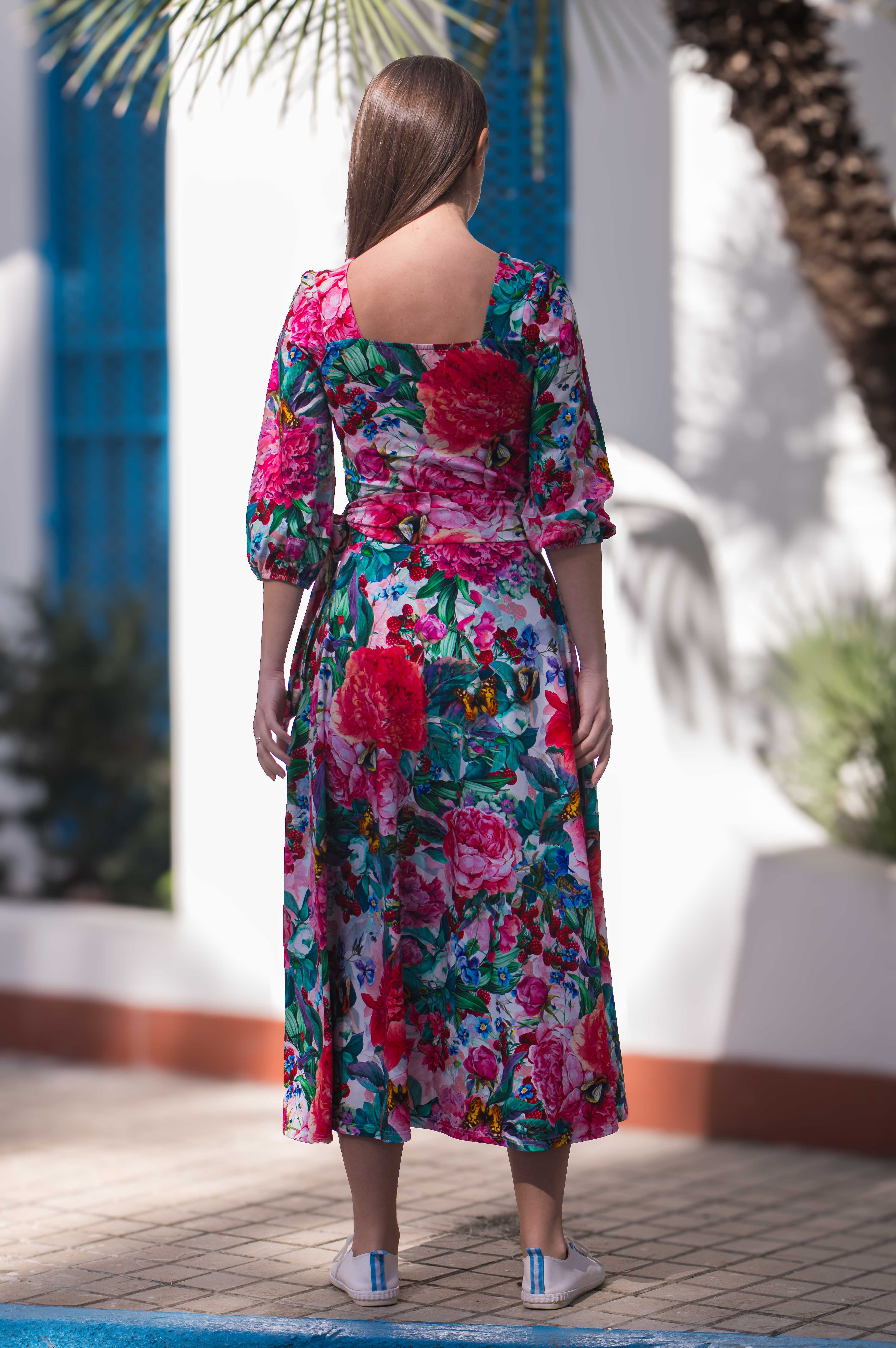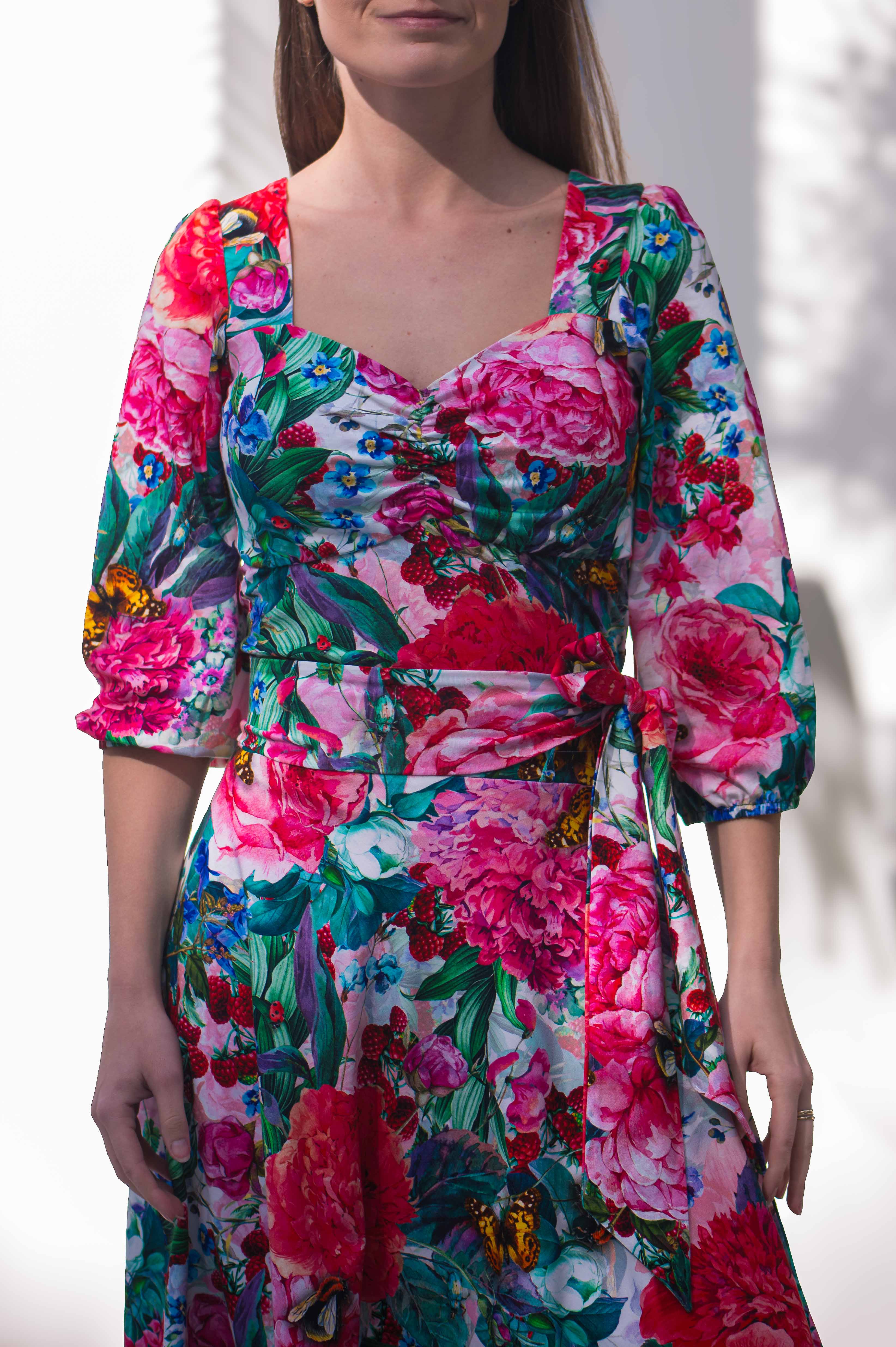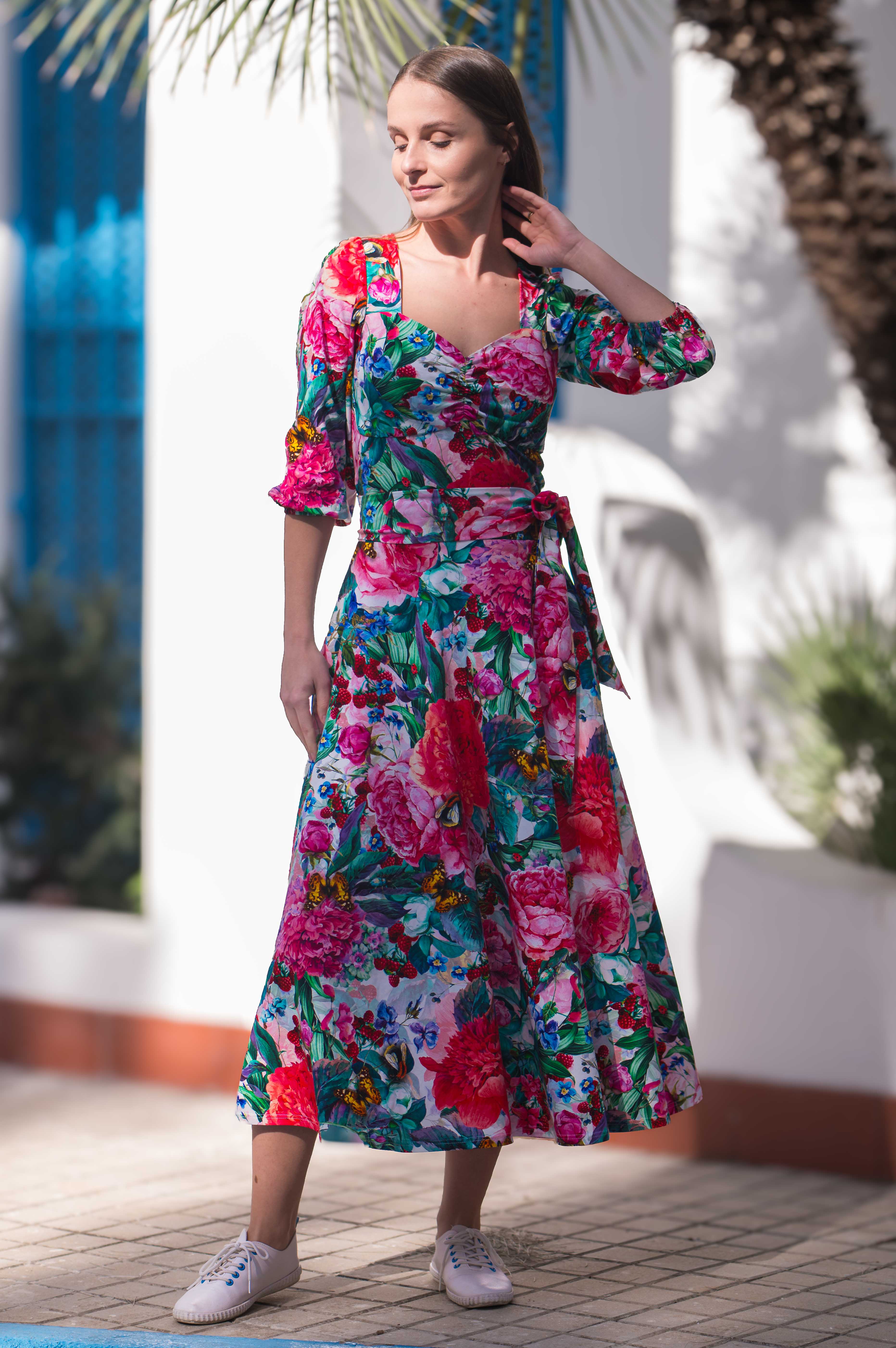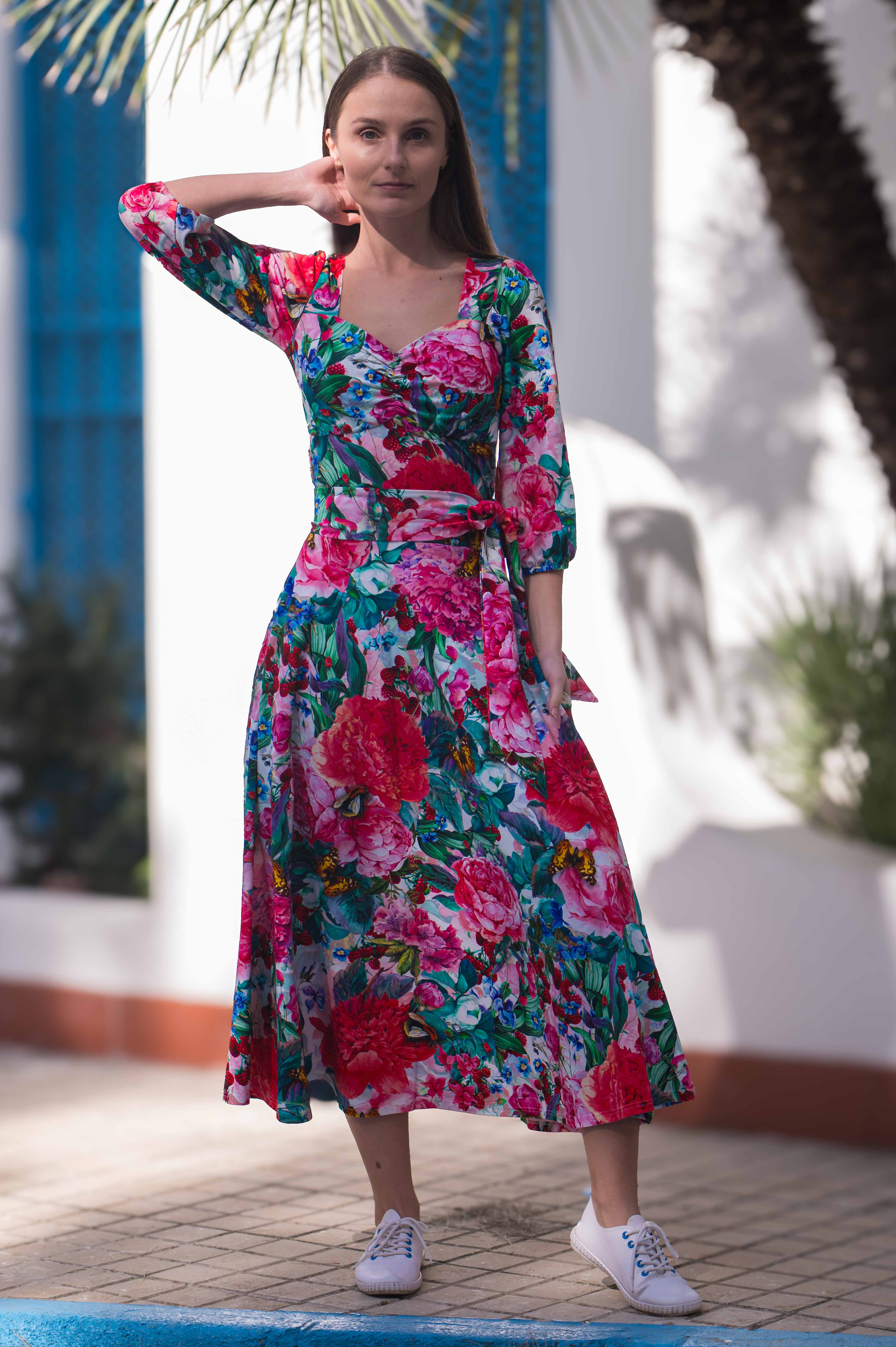 NOWOŚĆ! Piękna sukienka MIDI z rękawem 3/4 i dekoltem w serce. To nasza wiosenno - letnia wersja sukienki HEART. Lekko wytaliowana i z szerszym dołem. Wykonana z elastycznej i miękkiej bawełny, zapewnia komfort noszenia przez cały dzień, a jej autorskie wzory dodają niepowtarzalnego uroku. Doskonale układa się zarówno na sylwetce zarówno z małym, jak i dużym biustem.