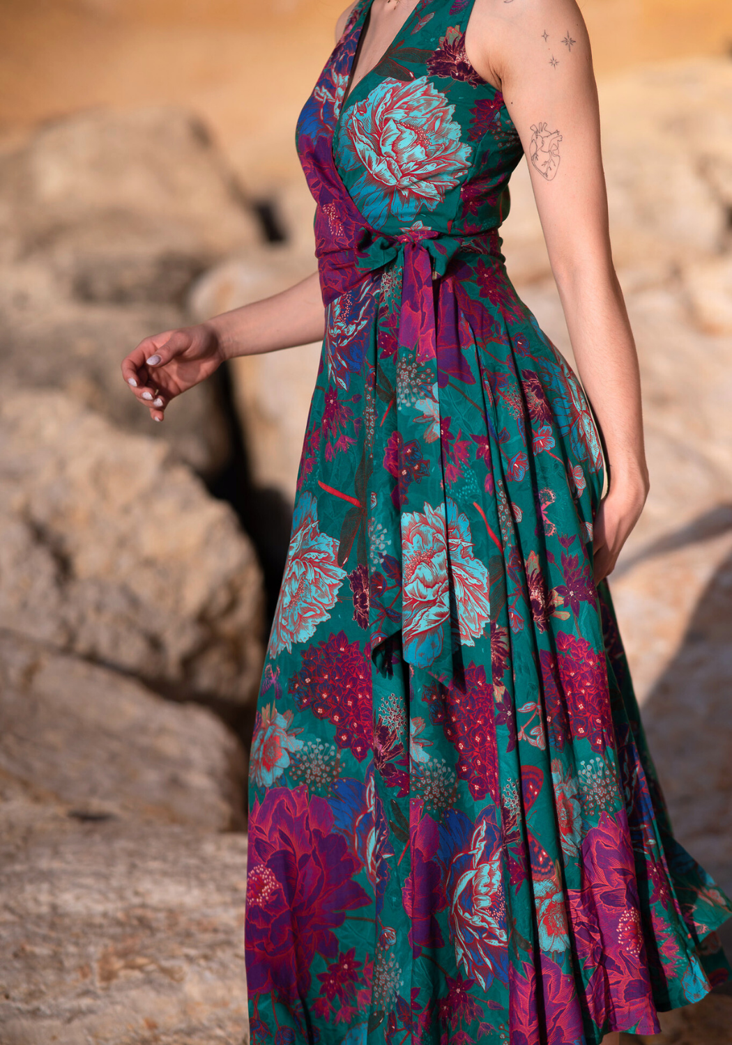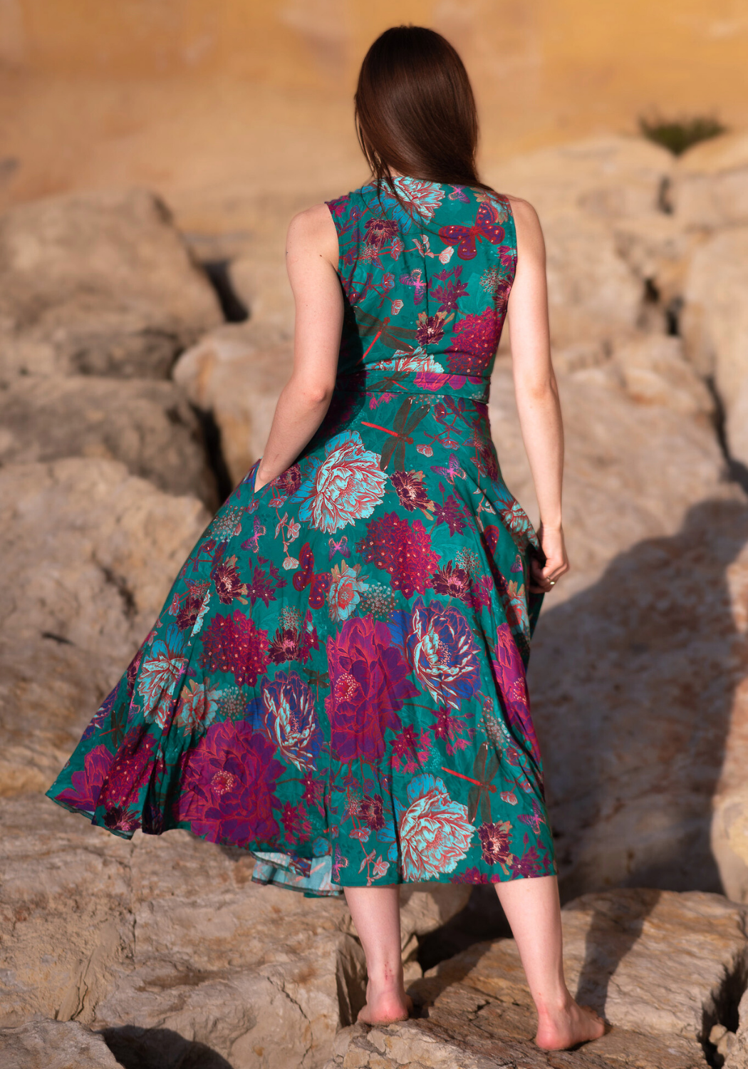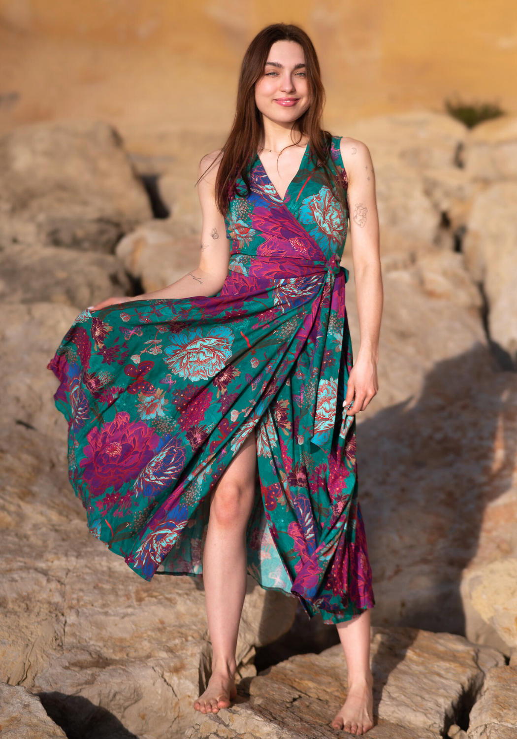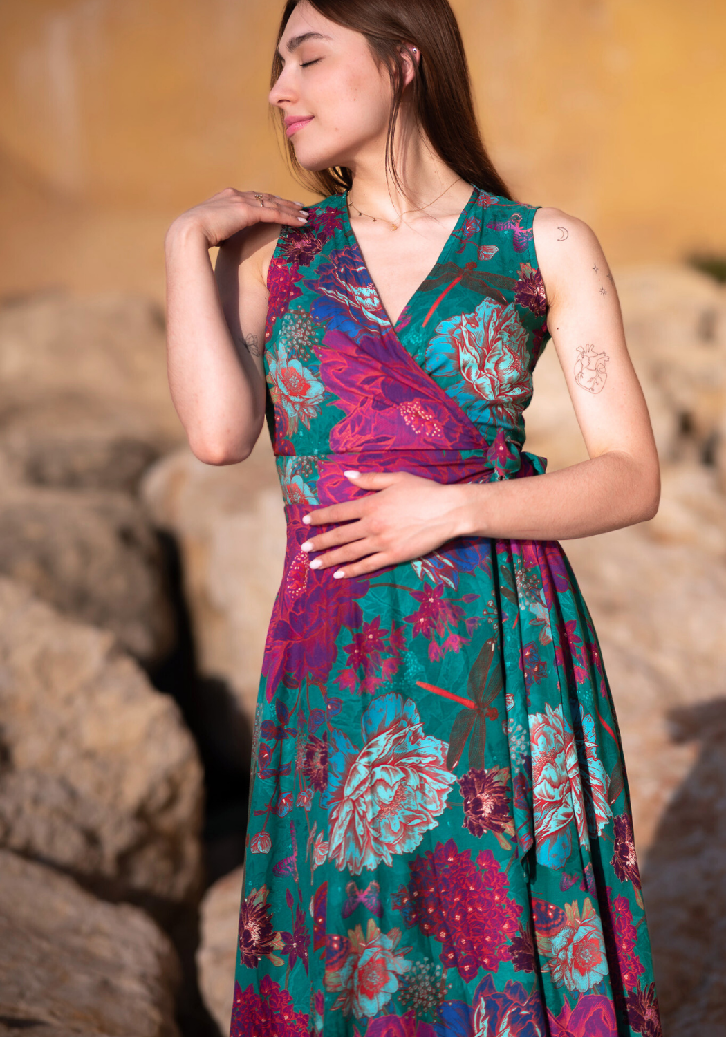 Lekka, wiązana sukienka MIDI z bez rękawa to nasz letni bestseller! Uszyta z cienkiej wiskozy z dodatkiem elastanu jest bardzo kobieca, a jednocześnie romantyczna. Sylwetkę możemy podkreślić talią, którą możemy regulować wiązaniami po wewnętrznej stronie oraz z boku. Dzięki wiązaniu kopertowy dekolt pięknie się układa. Kieszenie znajdują się po bokach na szwach. Dzięki swojej objętości materiału pięknie pracuje w ruchu i na wietrze, doskonale sprawdzi się zarówno na wakacjach, podczas romantycznej kolacji lub jako sukienka na wesele.