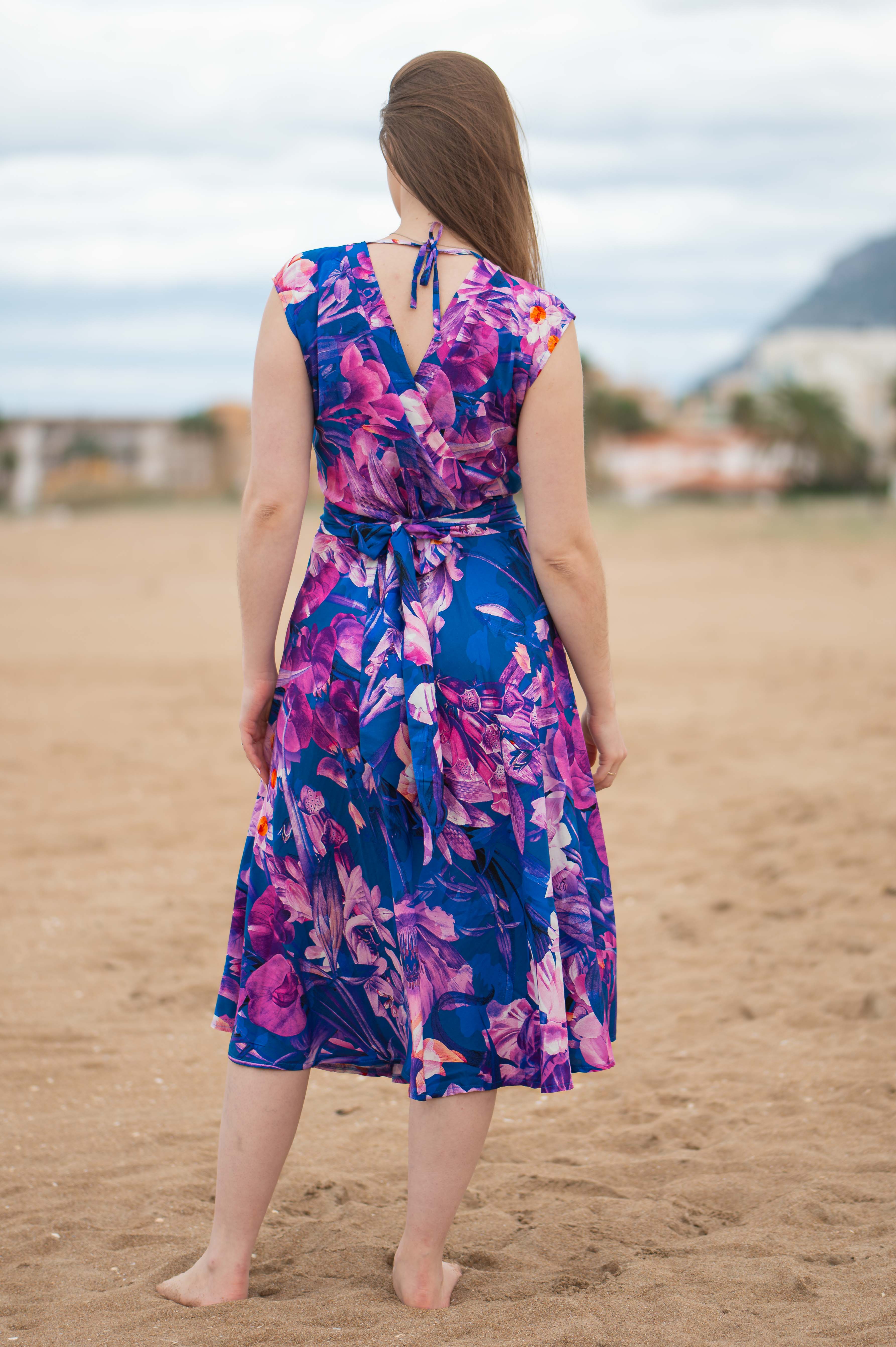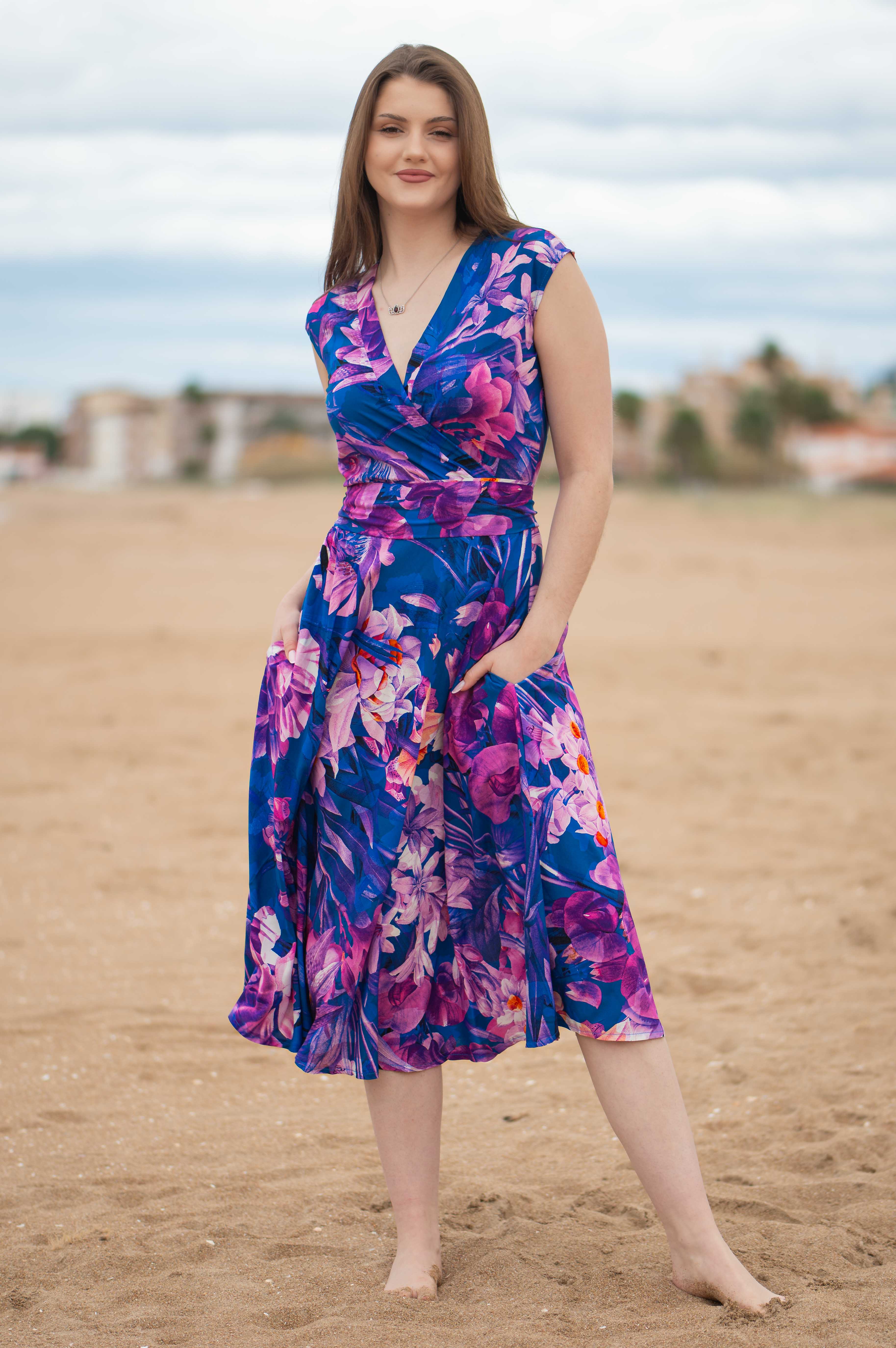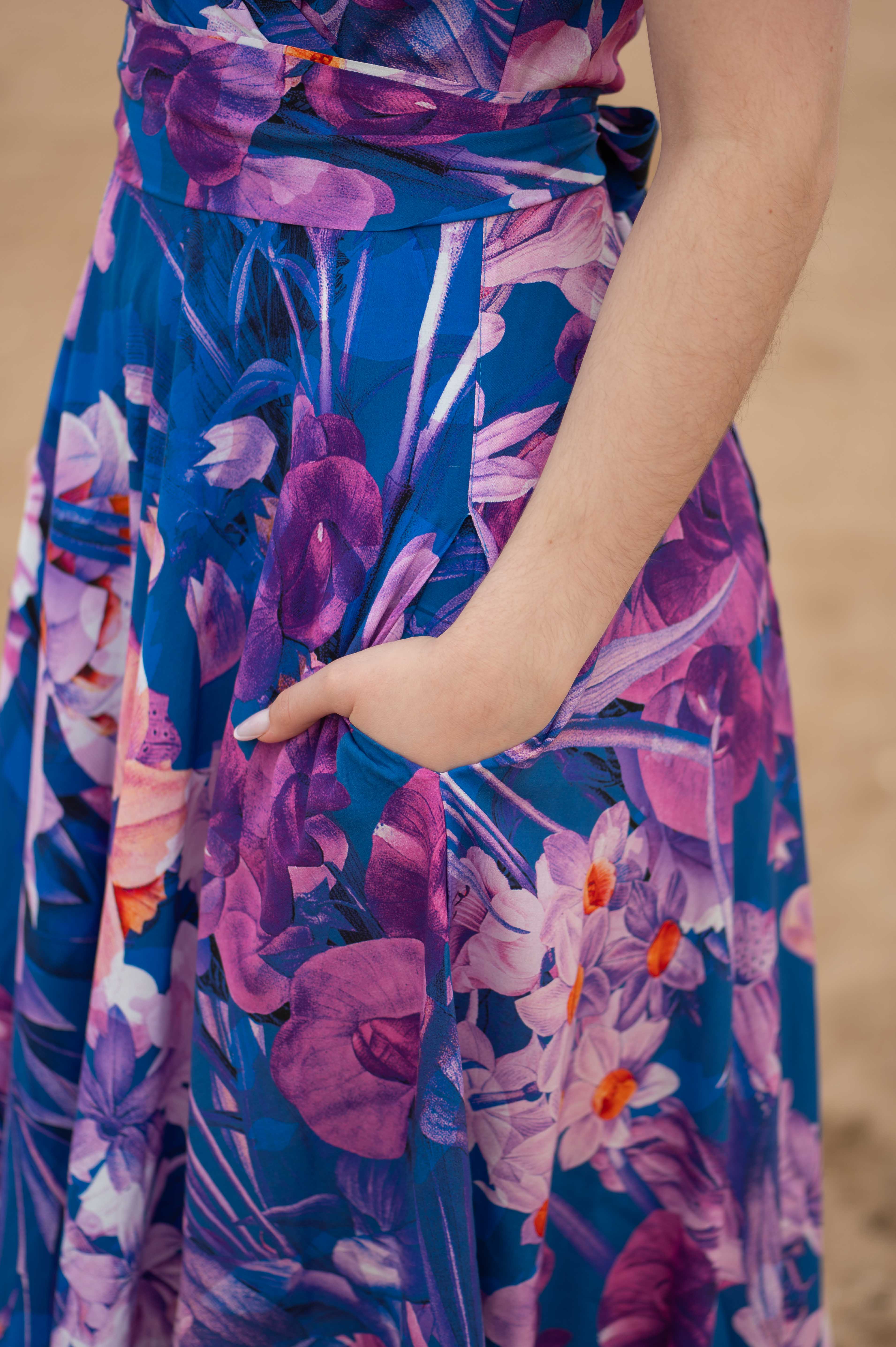 Kopertowy dekolt, troczki wiązane na szyi oraz praktyczne kieszenie nadają jej wyjątkowego uroku i funkcjonalności. Piękne autorskie printy wprowadzają subtelną lekkość, tworząc romantyczny i kobiecy look na ciepłe dni. Sukienka posiada również lubiany przez nasze klientki delikatny rękaw motylek, który subtelnie przysłania ramiona, dodając całości kobiecego wdzięku.